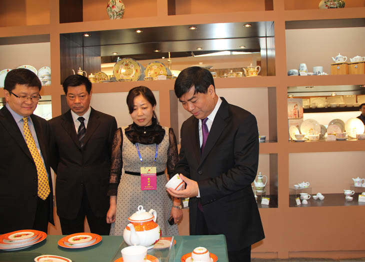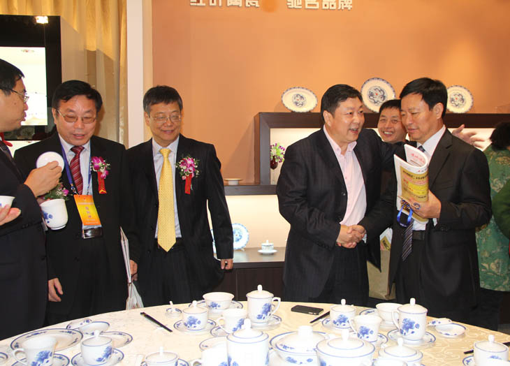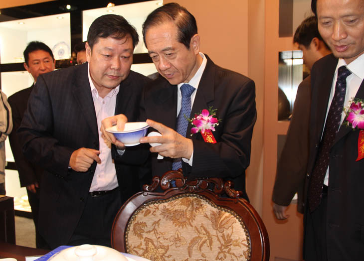 全國人大常委會副委員長韓啟德在我公司展館參觀,對我公司在全國青花玲瓏及青花日用陶瓷器形與裝飾設計大賽金獎作品《憶漢》非常感興趣