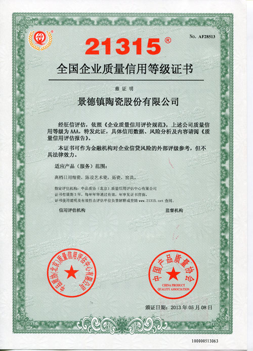 景德鎮(zhèn)陶瓷股份公司再次榮獲“全國(guó)企業(yè)質(zhì)量信用等級(jí)AAA級(jí)證書”
