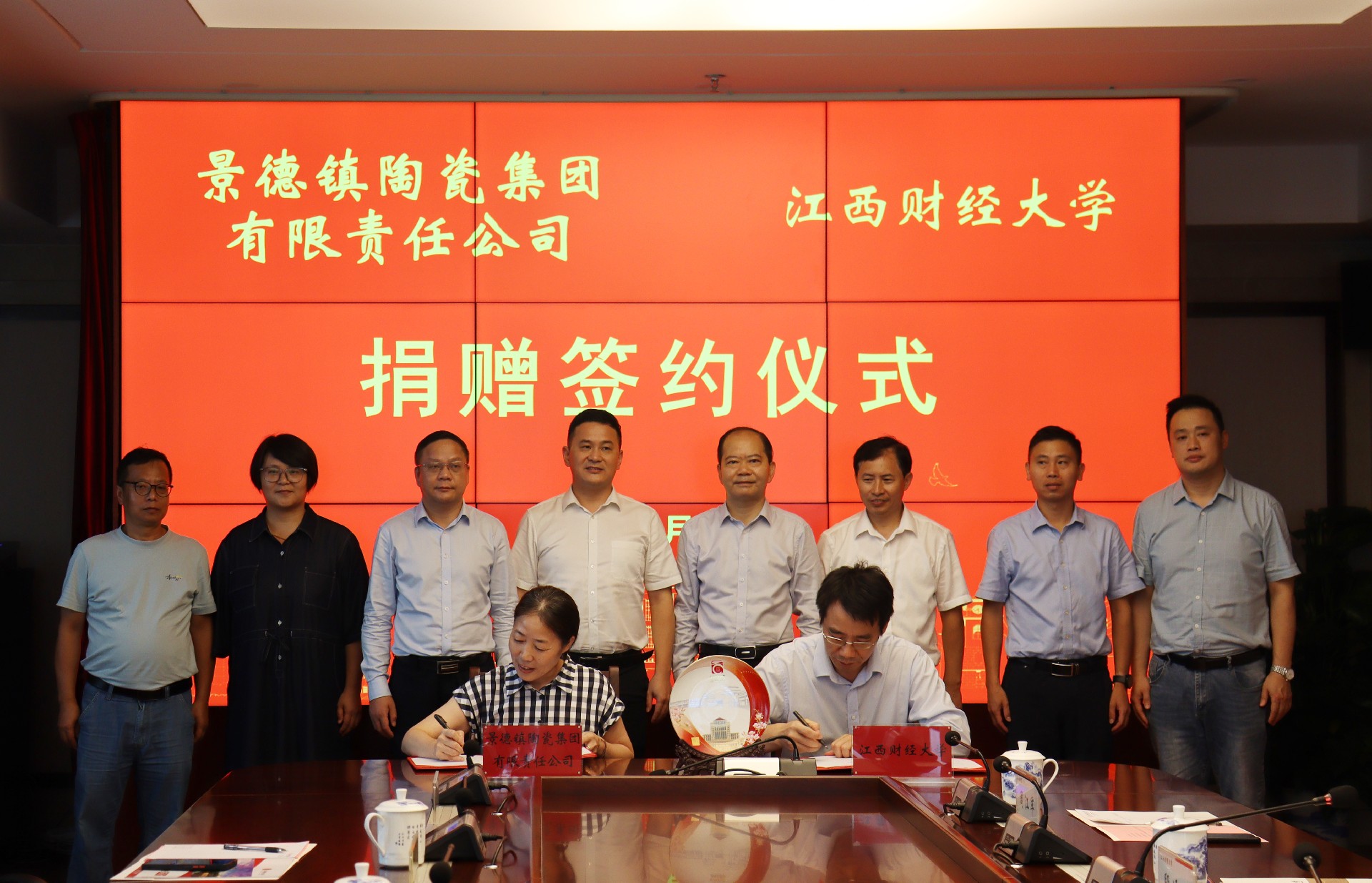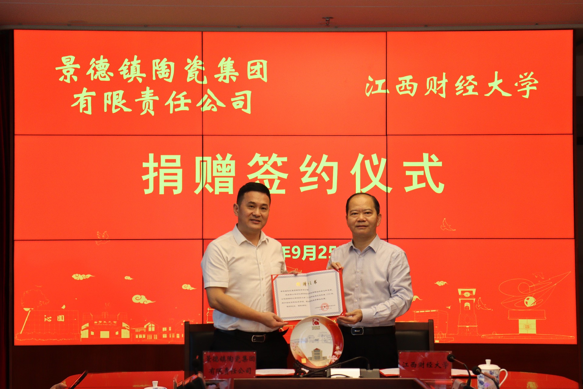 簽約儀式上,吳愛云代表景陶集團(tuán)與江西財經(jīng)大學(xué)簽署捐贈協(xié)議,并捐贈紀(jì)念瓷盤,鄧景揚(yáng)代表景陶集團(tuán)接受江西財大頒發(fā)的《捐贈證書》。