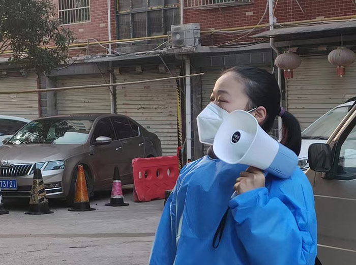 在這場沒有硝煙的戰(zhàn)“疫”中,邵建華與邵燕翎既是父女,更是“戰(zhàn)友”。父親每日在現(xiàn)場維持秩序,女兒每天拿著喇叭挨家挨戶的督促居民下樓做核酸,幫助老年人出示核酸碼等工作。父女倆各盡其責(zé)、互相鼓勵(lì)、并肩作戰(zhàn),用最樸實(shí)的行動(dòng)筑牢疫情防線,他們和大家一樣,希望通過共同努力,早日戰(zhàn)勝這場疫情阻擊戰(zhàn)。